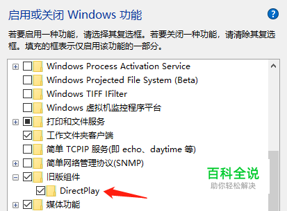 展开“旧版组件”,勾选“directplay”,点击确定,它会自动进行安装,成功之后,就可以尽情地全屏地游戏了。