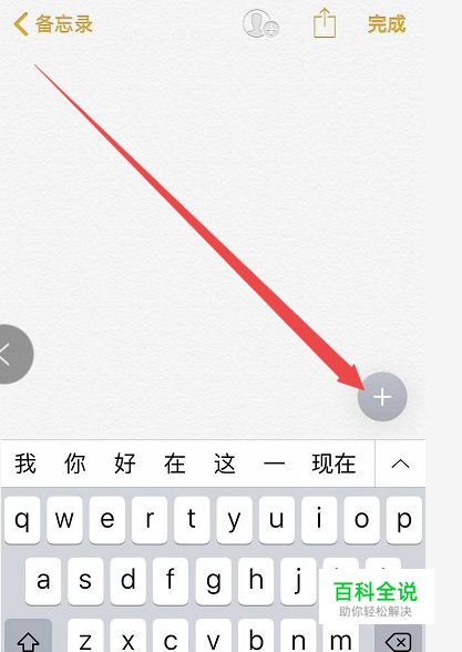 进入到新建备忘录页面之后,我们可以看见这个页面目前是空白的,并且右下角还有一个灰色的圆圈,中间有一个+号。我们就点击这个+号。