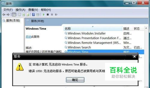 发现自已电脑的时间老是不准确,后来才发现,是没有与Internet时间同步,于是到控制面板的“日期与时间”中,勾选了“与Internet时间服务器同步”这一项,但是后来发现,时间仍不准确,仔细追查了一下原因,原来没有启动Windows时间服务,即“Windows Time”,进入系统服务后,启动时间服务,却发现启动不了,如下图,这是什么原因?又要怎样解决?