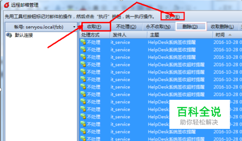 2、Ctrl+A选中所有邮件(或者按住Ctrl键鼠标选中你需要的邮件),然后单击【收取】再单击【执行】这样就可以将邮件下载到本地了: