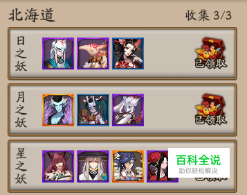 北海道 日之妖:妖狐、食梦貘、三尾狐 月之妖:荒川之主、丑时之女、白狼 星之妖:夜叉、青坊主、荒、青姬