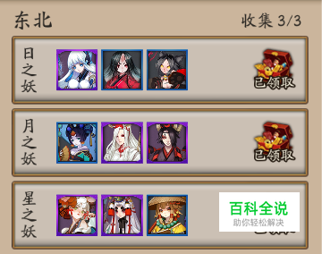 东北 日之妖:雪女、座敷童子、九命猫 月之妖:椒图、鬼使黑、鬼使白 星之妖:追月神、鸩、数珠