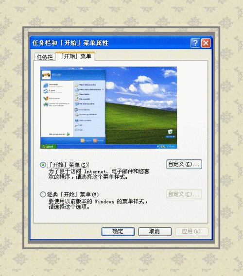 ①点选 【开始】菜单和 经典【开始】菜单,就会改变开始菜单弹出后的视觉效果。 ②设置完毕点击 应用按钮,就会生效,但不会关闭设置对话框,点击 确定才会关闭。