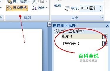 选择窗格可以干什么? 一是可以调整各个元素在画布上显示的图层。 二是将不想显示的图层隐藏掉,这里需要注意的是,这个隐藏是真隐藏,就是你把这个元素在这里选择不显示,那么在ppt播放的时候它也是不会被显示出来的。 如下图所示, 这个十字被隐藏后,那么在播放的时候也是看不到的。