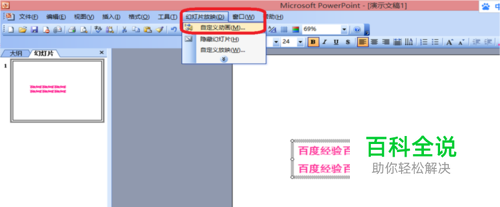 选中文本框,点击“幻灯片放映”,在下拉框里选择“自定义动画”,ppt右侧就会出现一栏自定义动画工具栏。