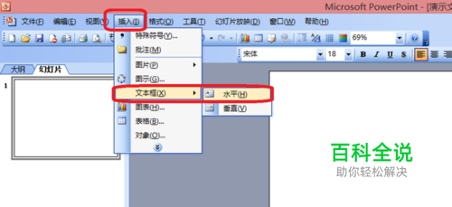 打开ppt,点击上方工具栏中的“插入——文本框——水平”,当鼠标变成十字形时,按住鼠标左键在ppt的页面中画出文本框,并把光标放到输入文字。