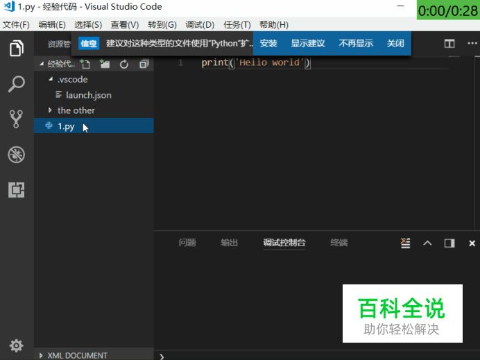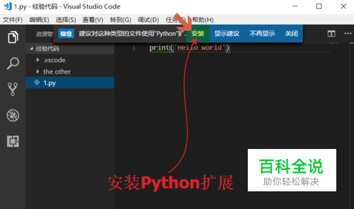 安装“Python”扩展。 当VS Code识别到Python程序后,会提示安装“Python”扩展,点击“安装”。