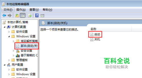 在打开的窗口左侧菜单中依次点击展开计算机配置—windows设置—脚本(启动/关闭),然后在右侧双击启动。