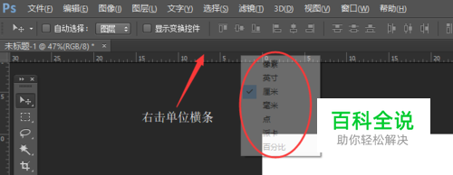 第一种方法:快速切换单位 首先看是否有打开标尺栏快捷键ctrl+r 打开标尺栏右击标尺栏会出现Photoshop有单位,点击需要切换的单位即可