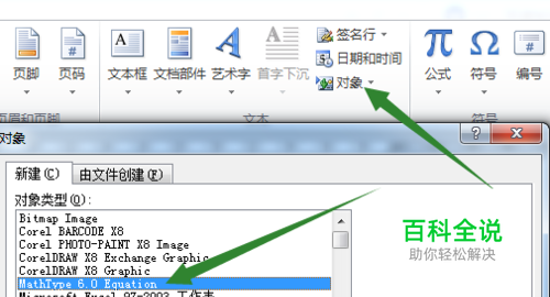 在右上位置,可以看到下图,点击对象,之后弹出一个窗口。然后,如下图操纵即可。当然有时候不是mathtype,而是公式3.0,都是一样的。