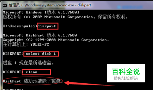 把优盘插到电脑上,等读出优盘来以后,打开命令提示符,输入“diskpart”,敲回车进入磁盘管理命令,继续输入“select disk 1”,继续输入“clean”,将优盘彻底格式化