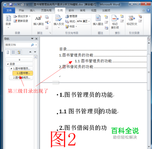 我们在“图书管理员的功能”下面加上低一级的目录“维护管理员功能”(也就是三级目录),这个低一级目录前面的序号其实是可以随便输入的,但是我们为了看起来整齐,就写成了“.1.1”