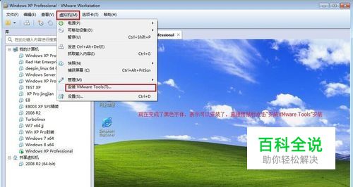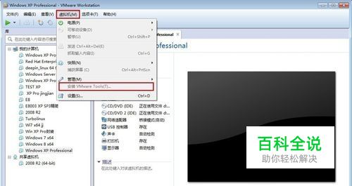 打开VM界面,如下图,我们可以很方便的找到安装VMware Tools这一项,但是现在是灰色的,代表不能安装,因为我们还没有进入某个虚拟机系统中,现在我们启动已经做好的windowXP PRO系统中。