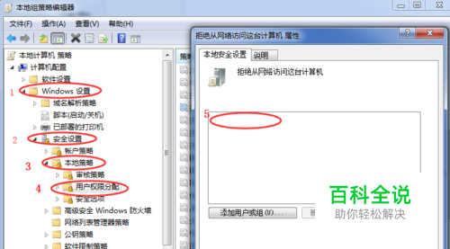 依次点击 ‘’所有程序-附件-运行‘’输入gpedit.msc后确认。 按照图片上的顺序完成对第5处上的‘guest’的删除。