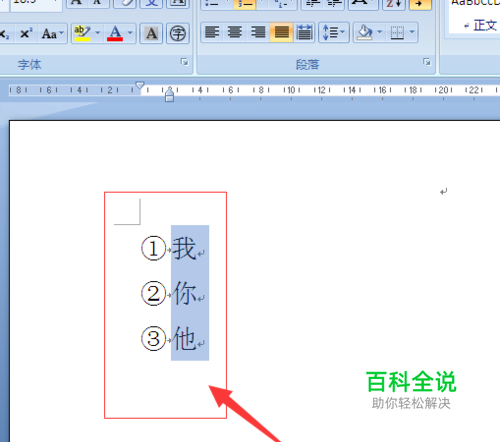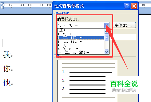 高手们看到这就行了,现在可以用了,以下为照顾小白 小白们,我随便写三行字,全选,点工具栏数字编号右边的小三角,点“定义新编号格式”
