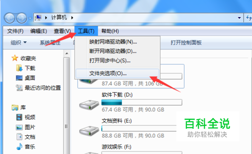 打开“计算机”——点击“工具”菜单——文件夹选项。