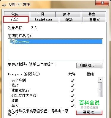 在u盘属性中,选择“安全”选项卡,然后点击“高级”按钮,如下图所示: