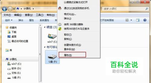 u盘连接上电脑,然后在我的电脑中找到u盘图标,鼠标右键点击它选择“属性”,如下图所示: