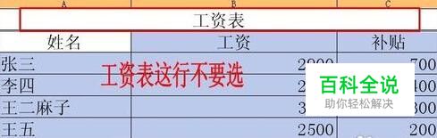 首先,先在WPS表格中输入好数据内容,选择表格,如图所示。注意不要选择工资表行。否则将无法排序,因为排序的时候不能有合并的单元格。