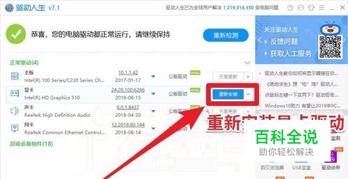 第三步: 将鼠标移动至显卡选项上后面的按钮上,按钮显示重装驱动,点击重装驱动,驱动重装后,重启电脑。重启电脑后,不再弹窗提示,问题即被修复。