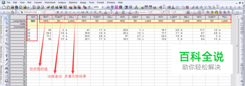 导入数据。将绘图数据导入OriginPro9.0,数据应该包含以下部分:值、标准误差、多重比较结果。若不需要后两者,则只需要导入绘图值即可。将标准误差设置为【Y Error】,显著性标记字母设置为【Label】。