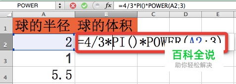 球的体积公式:V =4/3 π r^3 在B2单元格中,输入4/3乘于PI函数返回值乘于POWER函数返回A2单元格半径的三次方,就是球的体积。