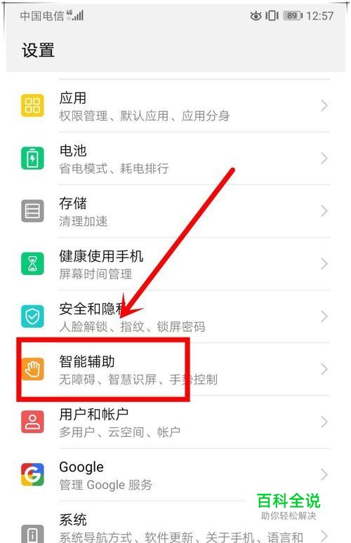 然后在设置页面,找到“智能辅助”选项,点击进入。
