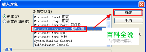 “插入对象”对话框中,选择“Microsoft PowerPointer 演示文稿”项,然后“确定”。