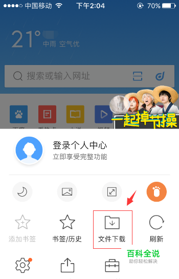 首先,在手机的浏览器中输入想要阅读的TXT小说,并且用浏览器下载下来。而后点击浏览器的“设置”,找到浏览器的“文件夹”选项,点击进入。