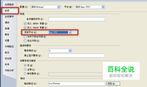 在属性窗口中点击【生成】,默认的目标平台中选项是any cpu。