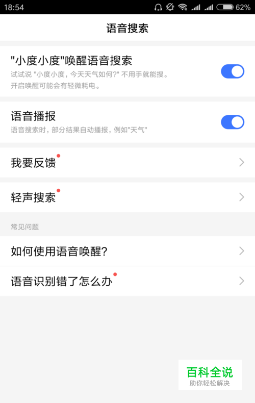 设置好以后“小度、小度”唤醒语音搜索后面的开关就会点亮了。设置好以后,我们直接在想搜索的内容前面加上“小度、小度”就可以了