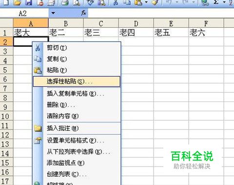 然后,点击第二行第一列,右键,“选择性粘贴”。