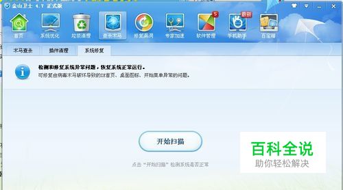 打开金山卫士,先系统修复一下,看看是不是缺少了系统的文件什么的
