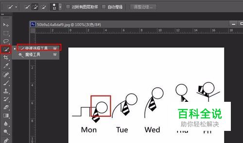 打开ps,打开自己想要上色的图。提示:填充颜色必须要先建立选区。顾名思义,就是先用ps软件选中自己想要填充颜色的那部分。找到“快速选择工具”,或者魔棒。这个工具适合背景色单调的颜色使用非常方便。如背景色是白色。