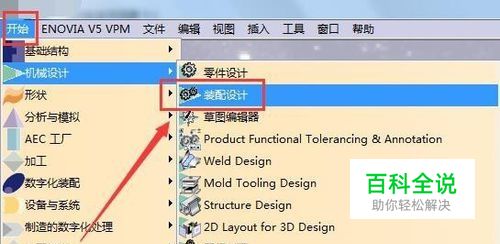 打开建模软件,在菜单栏,点击开始,如下图,最终找到装配设计,点击即可启动此模块,进行模型设计。这里启动此模块,只是为了找到零件库。