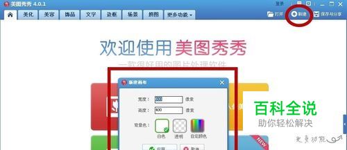首先我们打开美图秀秀,点击屏幕右上方的新建,新建一个画布,选择一个背景色,还有高度和宽度也是可以按照自己的喜好调解的。