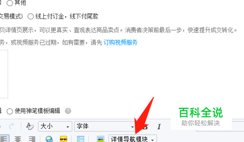 点击进入发布宝贝的界面,在宝贝描述的时候,我们可以看到相应的“详情导航模块”,这就是我们需要的。