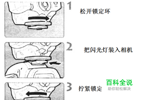 首先安装闪光灯到相机上:先松开锁定环——滑动闪光灯插入相机插座——按照松开的反方向拧紧闪光灯。