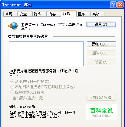 禁用拨号连接:打开IE浏览器,点击 工具 >Internet选项,选择 连接 > 从不进行拨号连接。