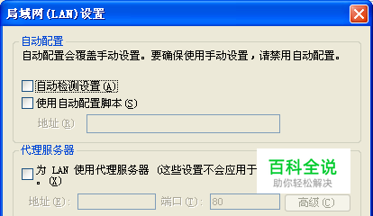 禁用网络代理:点击 工具 >> Internet选项,选择 连接 >> 局域网设置,确保三个选项均未勾选,点击 确定。