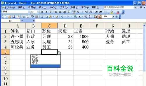 首先,打开要进行处理的Excel2003工作簿,在G列输入各部门名称,在H列输入各职位名称。