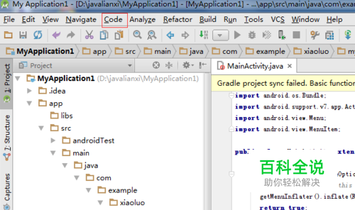 然后进行点击Android studio菜单中的“code”的选项菜单。