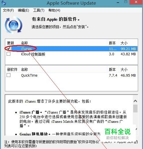 然后就到了 Apple Software Update 的界面,这里提示有哪些软件目前是可以进行更新的,因为我们只需要升级 iTunes ,所以在这里我们只把 iTunes 的前面给勾上就行了。然后右下角的“安装1项”,如果你选择了两项,它就提示有2项,这个与你所选的有关。