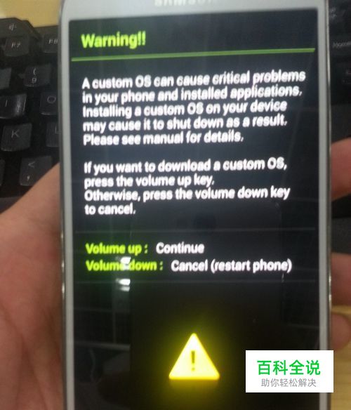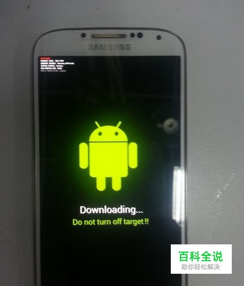 1.拿过手机装上电池,然后按住“音量-键”和三星“home”键(即屏幕中间的那个键)在开机,开机后会出现很多英文(国行机是显示中文)如下图。