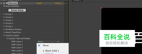 再次新建一个固态层,选择element,在custom test and masks中选择path layers1,选择出我们所要的文字