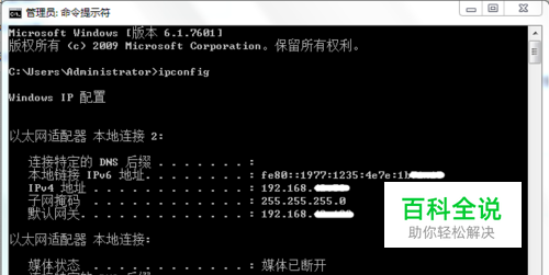 (2)使用ipconfig查看计算机的上网参数 1、单击“开始|所有程序|附件|命令提示符“,打开命令提示符窗口 2、输入ipconfig,按Enter确认,可以看到机器的配置信息,输入ipconfig/all,可以看到IP地址和网卡物理地址等相关网络详细信息。