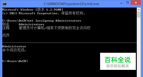 接下来在打开的cmd程序(命令提示符)中输入下面的命令(建议直接复制粘贴命令)按回车键(Enter)键执行: net localgroup Administrators 查看屏幕显示的”成员“中是否只有一个Administrator账户(如图2所示),如果只有Administrator账户那么我们就可以继续下面的步骤了,但是如果除了Administrator外还有其他的账户,例如:admin、HomeGroupUser$……那么很遗憾,这篇文章的解决办法对您的电脑无效。