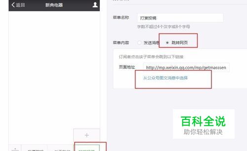 添加一个只有一级的菜单栏(不要添加二级菜单),输入菜单名,选择“跳转到网页”,点击下方“从公众号图文消息中选择”