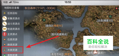蜂蜜可以通过游戏内采集树木时有一定概率获得,我们乘坐飞机来到秋日森林地图,点击地图查看木类资源的标志。