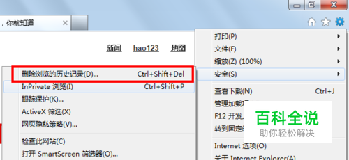 打开IE浏览器,点击右上角的齿轮设置图标,选择” 安全“——” 删除浏览的历史记录“。